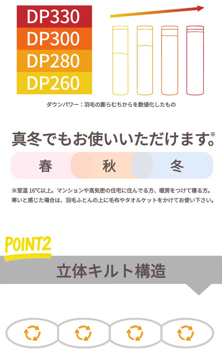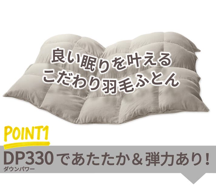 羽毛が片寄りにい設計で、ぬくもりをサポート。