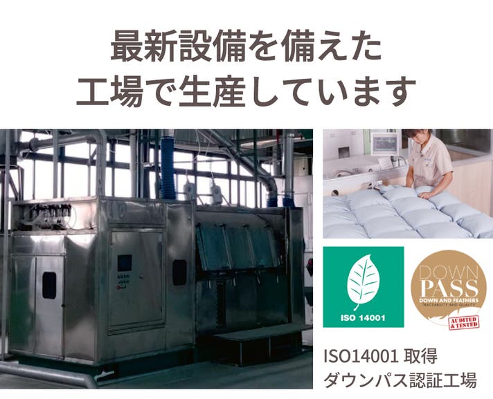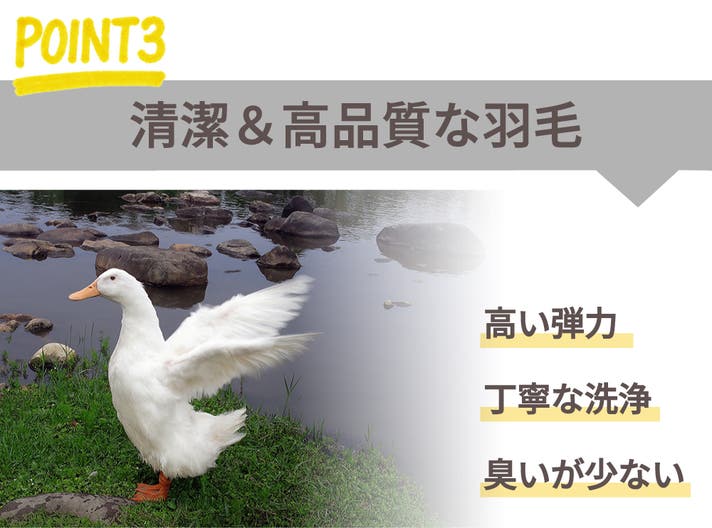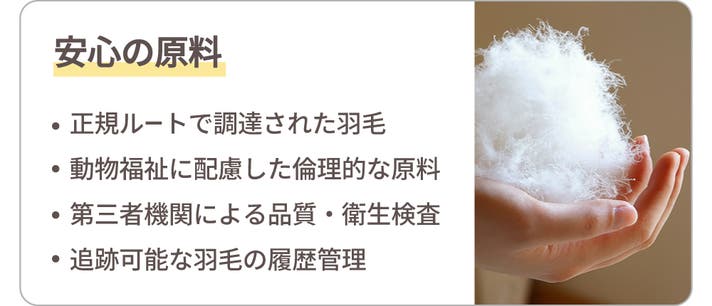 日本国内および国際的な規格J-TAS認証基準を満たした信頼できる原料のみを採用しています。また、動物福祉に適った飼育環境から得られた、ライブプラッキング(羽毛を引き抜く残酷な採取)を行わない羽毛を使用しています。