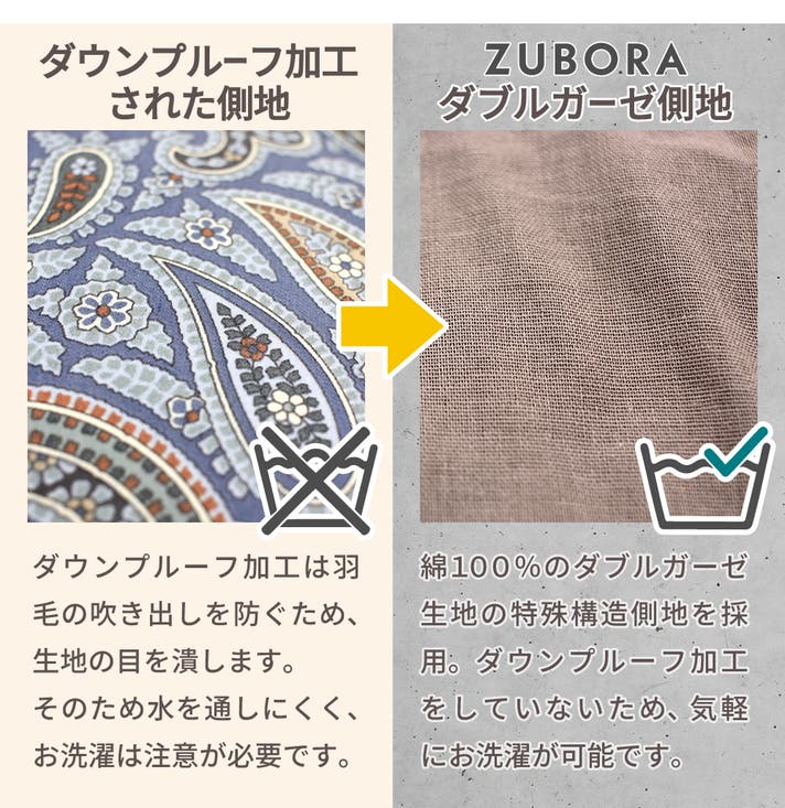 また、羽毛ふとんの厚みは一般的にシングルで1.0kgから1.3kgというのが業界の常識でした。でも、最近の暖冬の影響や、マンションの気密性の良さで、そこまでの羽毛量が必要とされないシーンも増えてきたんです。家庭で洗える羽毛ふとんの量を検証を重ねて、0.7kgという羽毛量に辿り着きました。またダブルガーゼを側地に採用することで、暖かさを補いつつ、羽毛ふとんに調湿効果をもたらすことに成功しました。カバーつけるのも面倒、クリーニングもイヤ。そんなライフスタイルのニーズに応えながら、従来の常識を打ち破るべくチャレンジを重ねて、製品化したのが本品「ZUBORA」です。