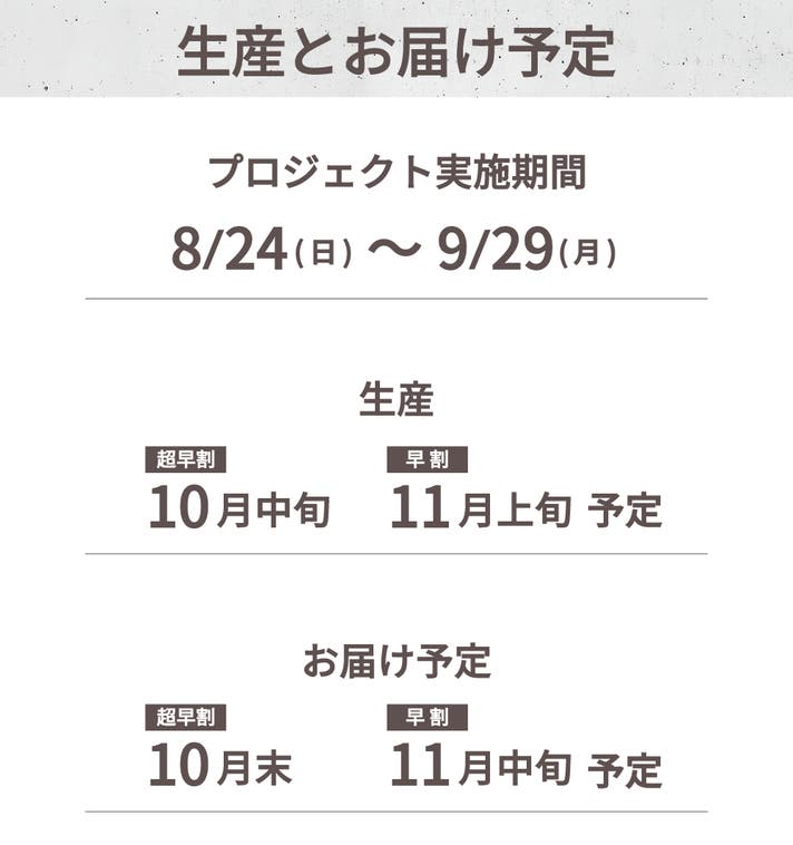●本文中に記載させていただいたスケジュールは、あくまでプロジェクト公開時点の予定です。応援購入の性質上、配送遅延のおそれがございます。 ●原則として、配送遅延に伴う応援購入のキャンセルはできませんが、リターン配送予定月から2ヵ月を超えた場合には、希望者に限りキャンセルにて対応させていただきます。 ●初期不良を除き開封及びご使用後の返品・返金はお受けいたしかねます。 ●仕様・デザイン・カラーについては変更になる場合がございます。 ●皆様の応援購入により量産効率が向上した場合、 正規販売価格が販売予定価格より下がる可能性がございます。何卒ご了承くださいませ。
