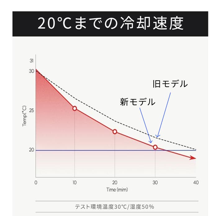 テスト:旧モデルとの比較で20℃に到達する時間が約10分以上早く冷えることが判明しました。