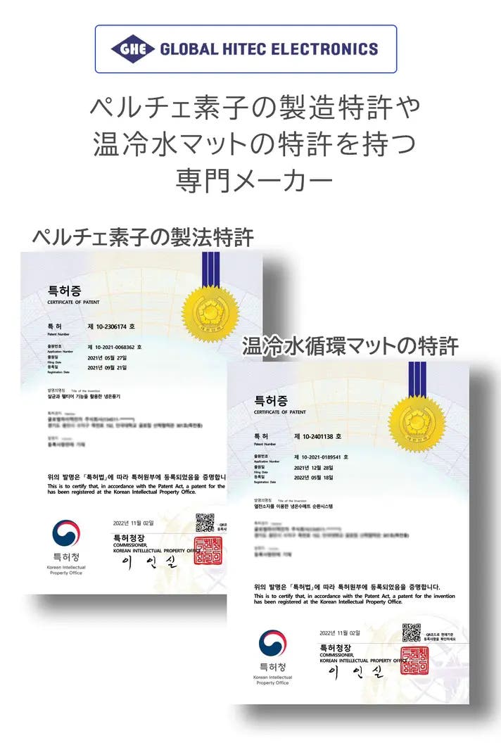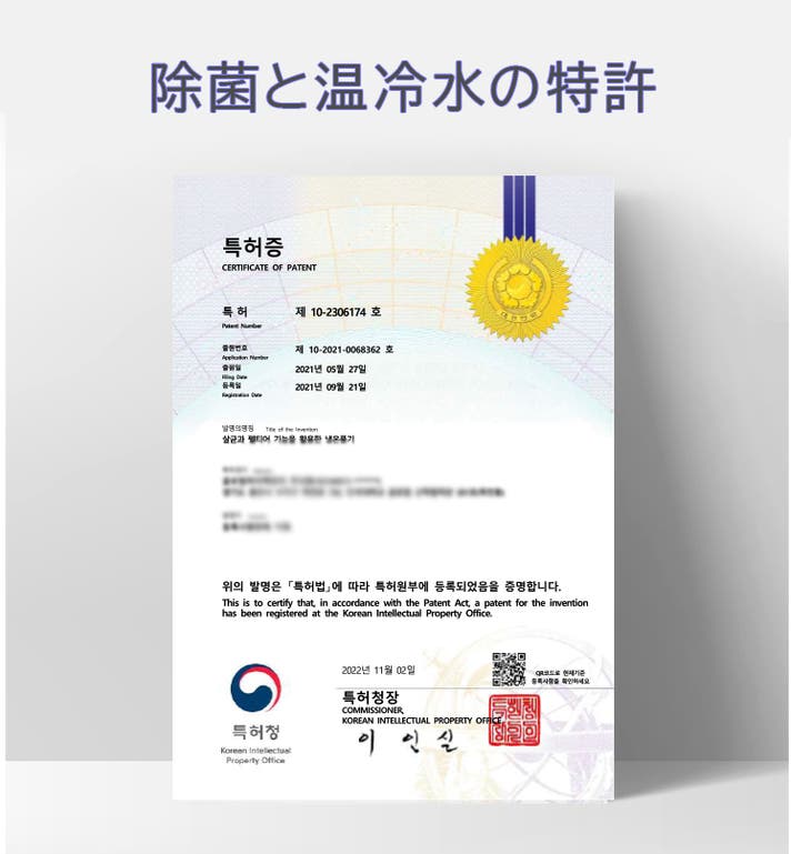 除菌機能と温冷水ユニットは韓国で特許取得しています。