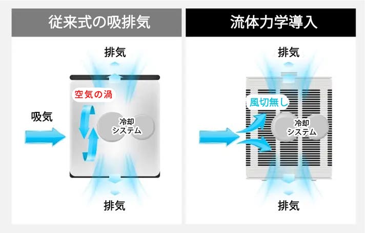 従来品は吸気した空気を内部で拡販することで内部を冷却します。それに対して流体力学を導入し、風の渦を作ることなくストレートに吸気排気を行い効率よく冷却します。