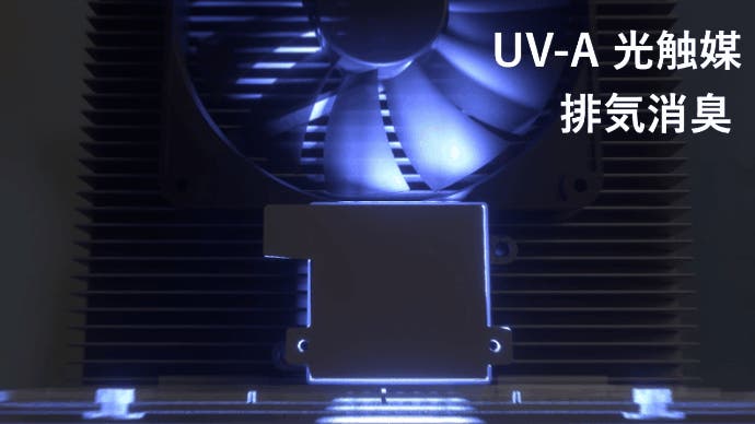 機器内部を循環した排気に匂いが無いようUV-A紫外線と光触媒による消臭を行います。UV-Aは除菌による消臭、光触媒は光に反応して消臭元を分解する効果があります。