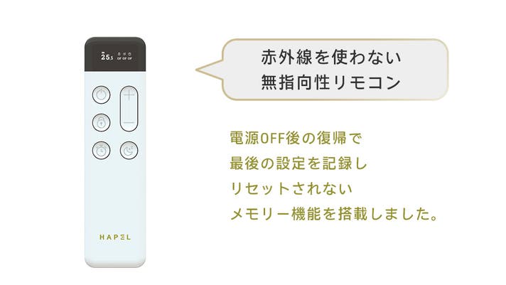 リモコンは本体に向けて操作することなく、寝ころんだ状態でも通信可能な無線リモコンを採用しています。この方式は常に電力を消費するため、一定時間操作しないと電源が切れます。その際、設定がリセットされないようメモリー機能を搭載しました。