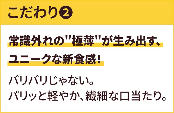 じっくりと熱で火を通す「ロースト製法」と、パリッと軽やかな食感を生み出す「0.9mmの極薄スライス」。