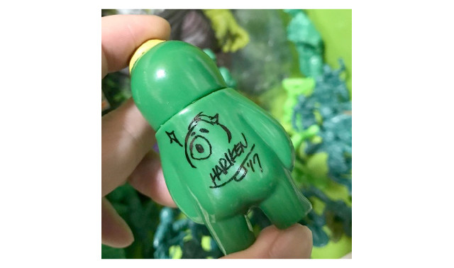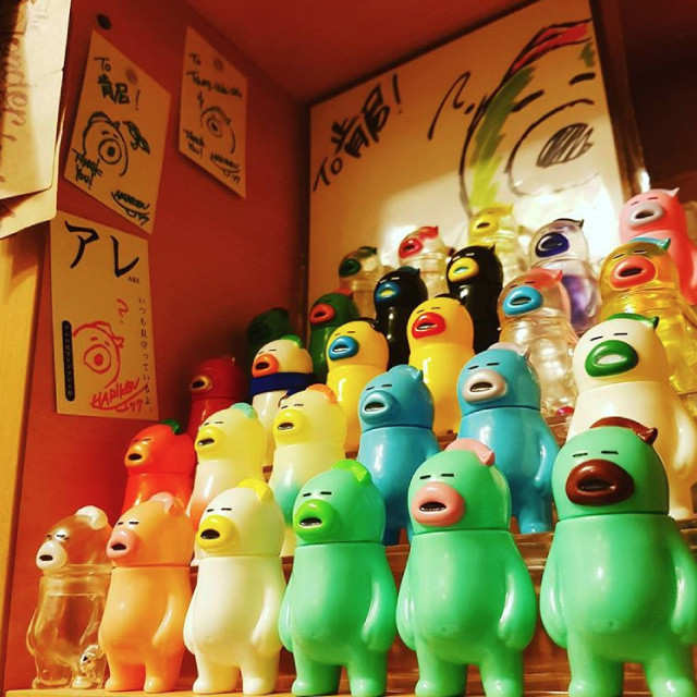 ↑海外のファンの方のコレクション写真。これまでに発売してきた『アレの見守りソフビ人形』たちとHARIKENのサイン。