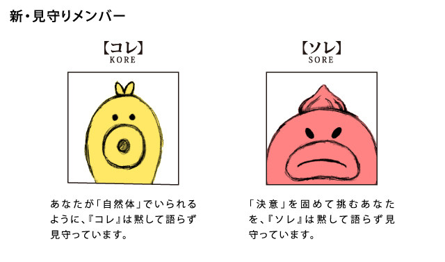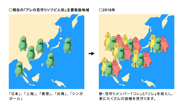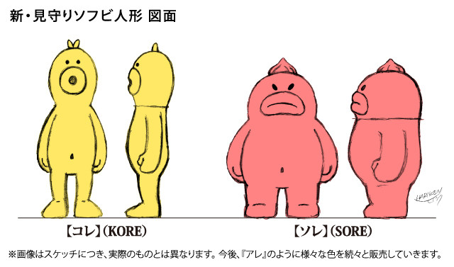 『アレ』の海外での人気の高まりと、ファンの皆さまの要望に応えるため、見守りソフビ人形の新メンバーとして『コレ(KORE)』と『ソレ(SORE)』の2キャラクターを増員することにしました。