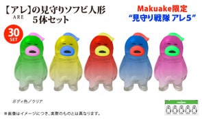 ソフビ人形にシリアルナンバーを入れた、限定の “見守り戦隊”カラーの『アレ』5体セットと、同色のステッカー5色セットをそれぞれ特製パッケージに収めてお届けします。