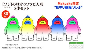 ソフビ人形にシリアルナンバーを入れた、限定の “見守り戦隊”カラーの『ソレ』5体セットと、同色のステッカー5色セットをそれぞれ特製パッケージに収めてお届けします。