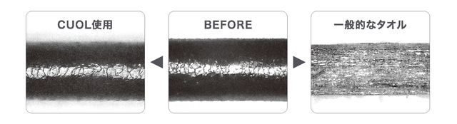 キューティクルがダメージを受けるもっとも大きな原因は摩擦で、タオルやヘアブラシの物理的な摩擦によって、剥離・減耗しやすいのですが、CUOLでは竹レーヨン糸を採用することで、タオル使用時の髪・頭皮へのダメージを大きく軽減することに成功しています。