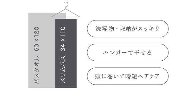 また、髪の毛の水分を十分に拭き取りつつも、幅が34cmなのでハンガーにかけられ乾燥時にも便利。バスタオルと比べ洗濯物や収納もかさばらないため、非常に使い勝手が良いオススメのサイズです。