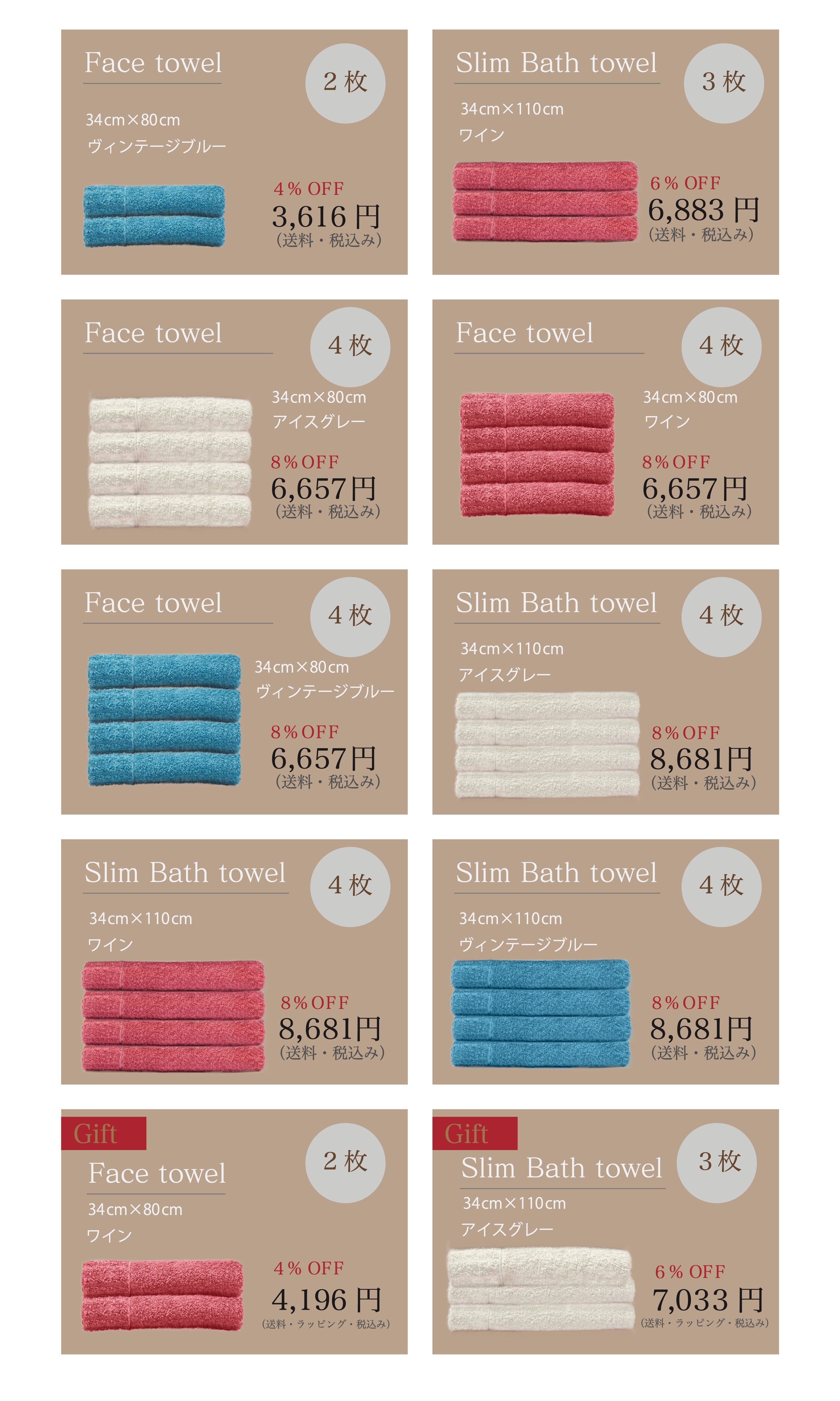 スリムバスタオル/フェイスタオル、各サイズとも2枚〜4枚までのセットをリターンとしてご用意しております。