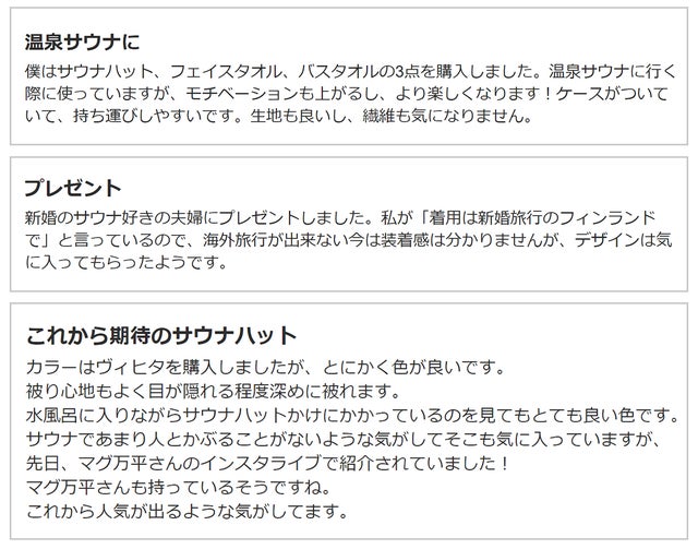 発売より「神田ポートビル」「タイムズスパ・レスタ」などフィンランド式サウナを備えた代表的な温浴施設でも展開いただき、フィンランドサウナを愛する方々にご愛用いだたいています。また、ヴィヒタタオルを販売するのオンラインストアでも、多くのサウナーの方より愛あるコメントが多数寄せられています。