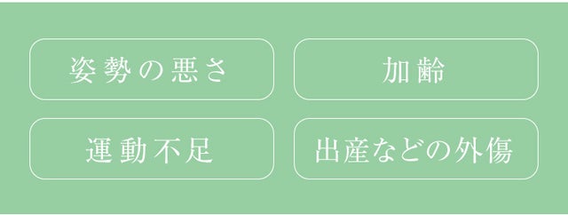 また、女性の場合は、出産時の骨盤周りの筋肉への負担が大きいです。適切なケアをしないと傷ついてしまった骨盤底筋群がそのままになり、100%機能を発揮できなくなります。