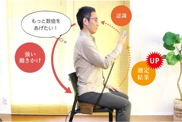 どこに力を入れていいのかと初めは戸惑われていましたが、適度な振動と骨盤を立たせる座面設計で正しい姿勢になったこともあり、始めて5分後には「あっ!きた!できた!」とコツをつかんでいただくことができました。
