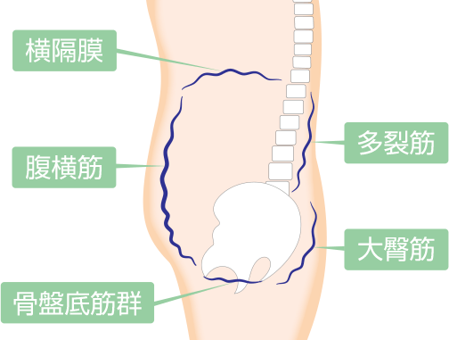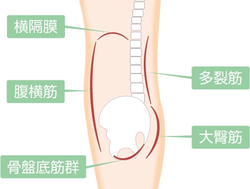 ・骨盤底筋群:骨盤の下部にハンモック状についている筋肉の総称。内臓を支える。
