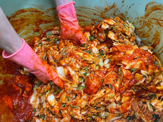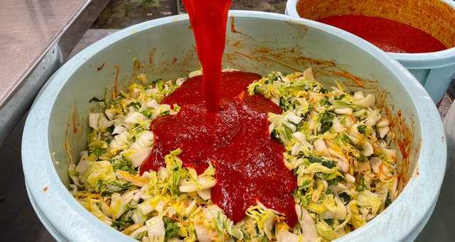 キムチを練って練り続けて40年!の専門のスタッフによる練り込み作業です!