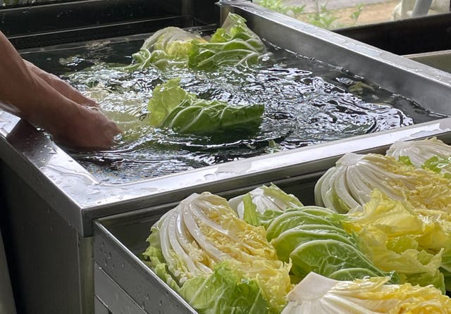 キムチの製造工程において、1度しか白菜を漬けないことが多いのですが、弊社の手作りキムチでは2度の漬け込み工程を行います。