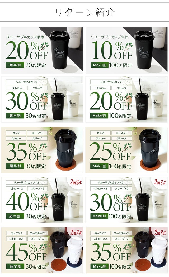【Maku割25%OFF】リユーザブルカップ、ストロー、スリーブ、コースター