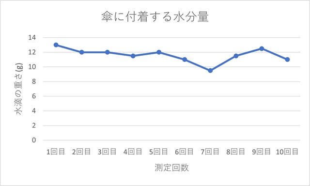 ビニール傘では親骨が60㎝のやや大きめの傘を使用し、雨の日の再現として、傘にまんべんなく水をかけ、傘を閉じて軽く傘を振った状態での水滴の合計量を計測した結果、平均約11mlとなりました。