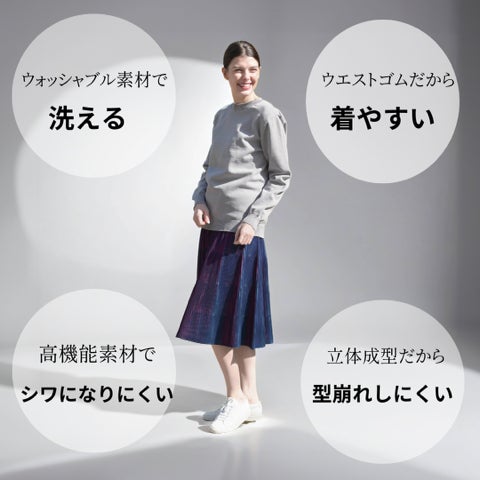スカートの形自体は、シンプルなミディアム丈のフレアスカートをベースにしており、年齢やスタイルを問わず着用可能です。(総丈70㎝、身長160cm)