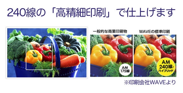 印刷クオリティはAMスクリーニング240線/ハイブリッドスクリーニング仕上げの高精細で階調豊かなオフセット印刷。