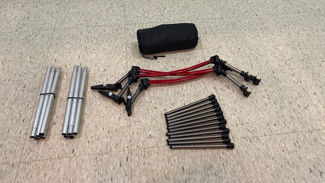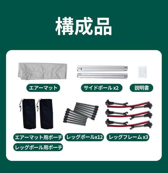 収納かばんを開けるとこのようにキャンプベッドの全ての構成品を見ることができます!
