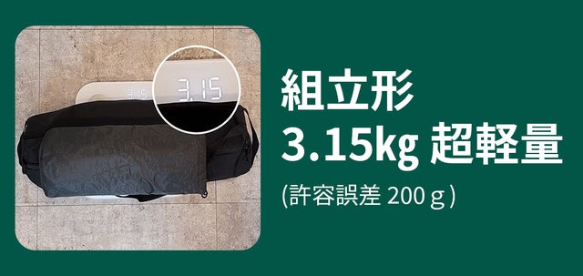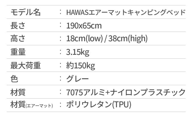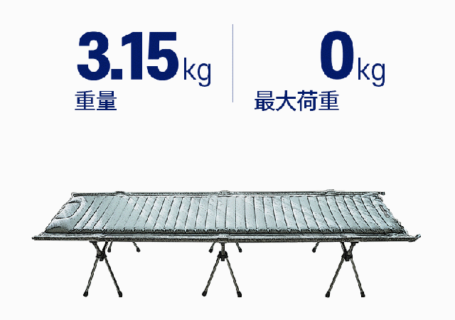 HAWASキャンプベッドの総重量はたった3.15㎏ですが47倍の重さである150㎏を耐えるほど丈夫に作られております。