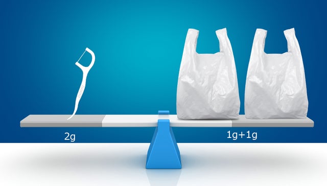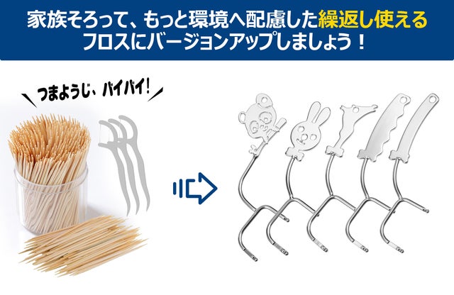 使い捨てのプラスチック製フロスは1本2g程度でレジ袋2枚分のプラスチックゴミが出ます。毎日2~3本で1年間で換算すると1人当たりおよそ2190枚ものレジ袋を消費することになり、環境への負荷が大きいです。