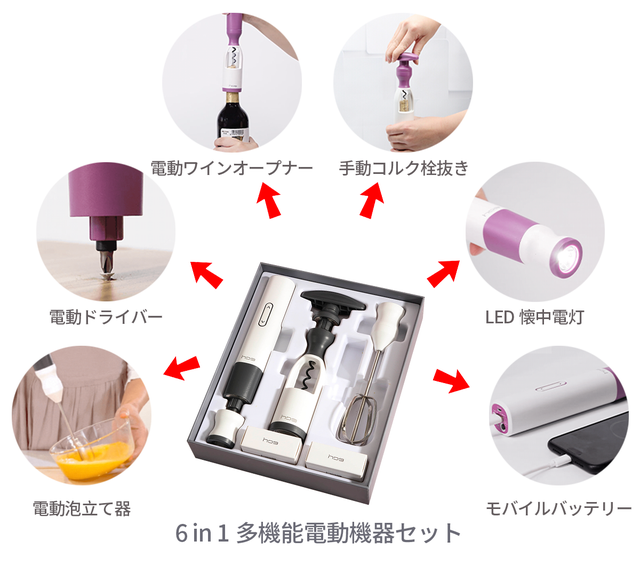 - 1台多役!ワインオープナー・泡立て等、あなたのスマートライフを始めよう!