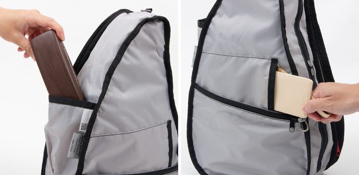 ファスナーポケット(左):バッグの隅にしっかり収まるファスナー付きポケット。レシートや小さなガジェットなど、散らばりやすいアイテムを整理できます。