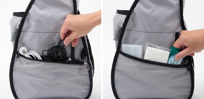 ファスナーポケット:イヤホン、リップバームなど「よく使う小物」はここへ。ファスナー付きだから安心感もあり、出し入れのストレスがありません。
