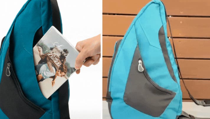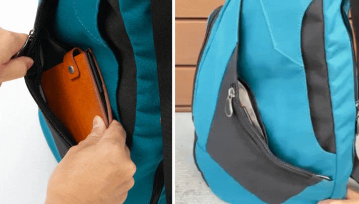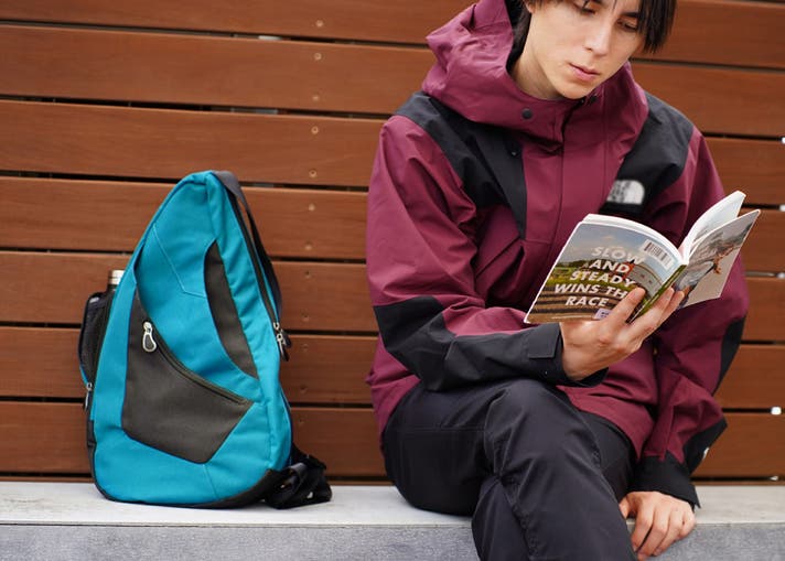 バッグを前に持ってくることで、背負ったまま、サッと荷物を取り出せます。また、メインジッパーは背負った時に内側になるので、セキュリティー面も安心です。