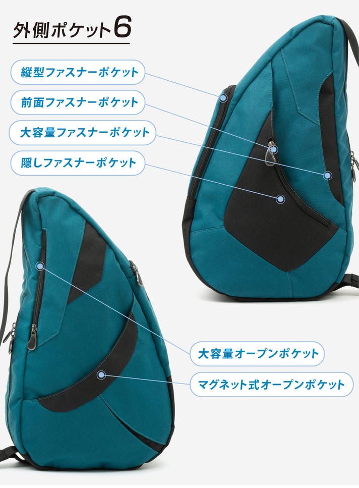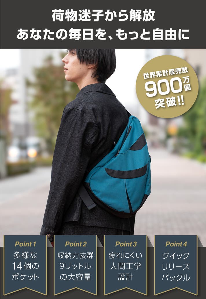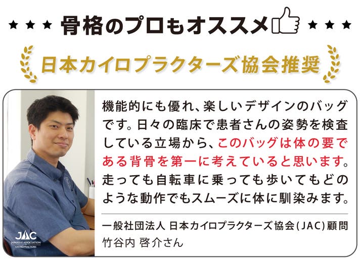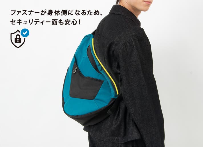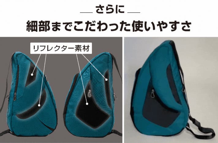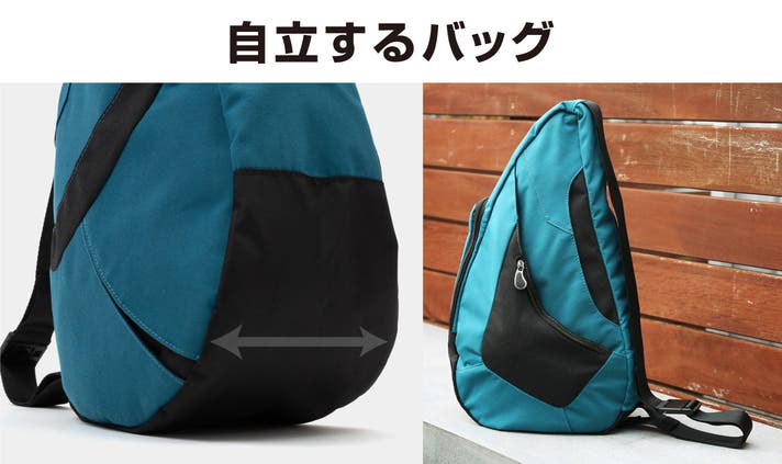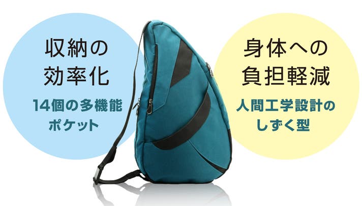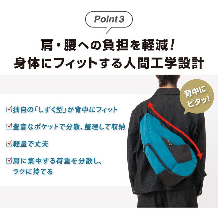このバッグは、医師やカイロプラクターの知見に基づいた「しずく型」デザインにより、荷物の重さを肩・背中・腰に分散させ、体感重量を軽減されるよう設計されています。
