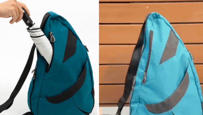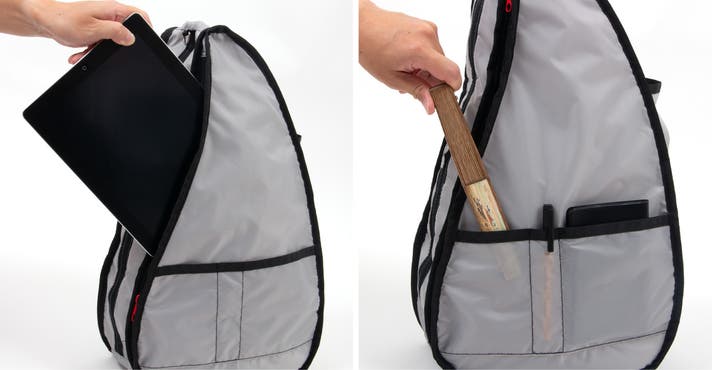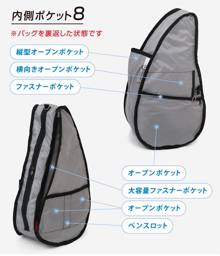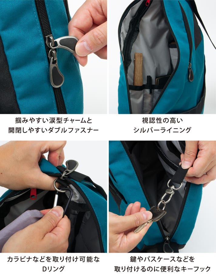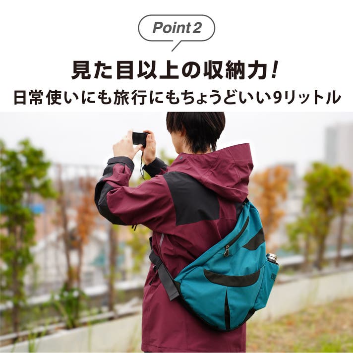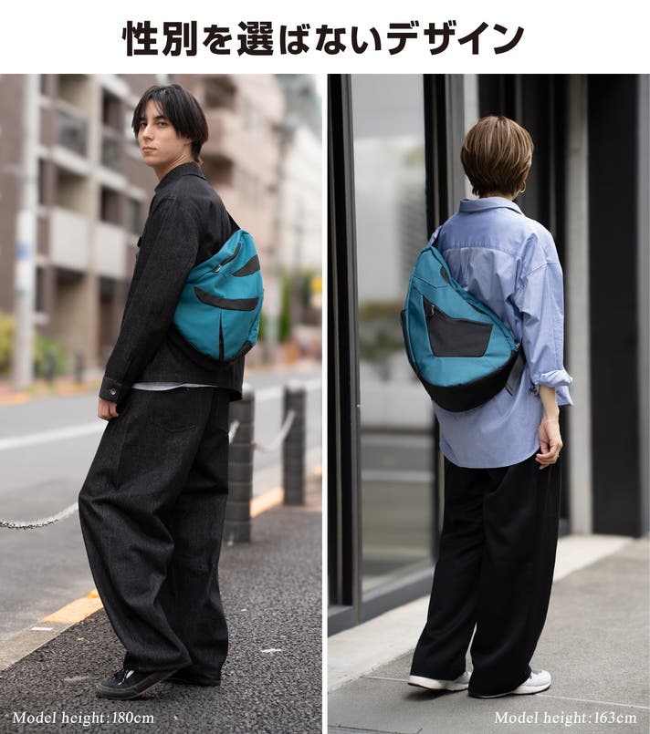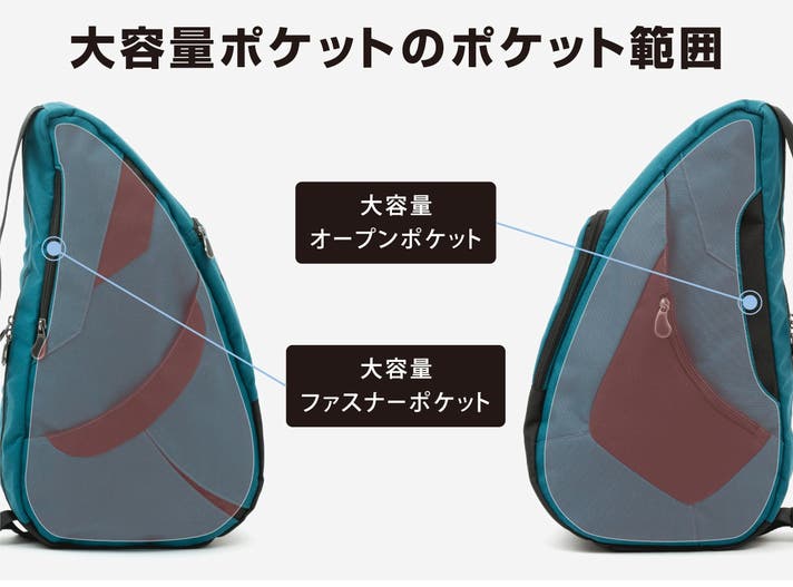 このバッグは、医師やカイロプラクターの知見に基づいた「しずく型」デザインにより、荷物の重さを肩・背中・腰に分散させ、体感重量を軽減されるよう設計されています。