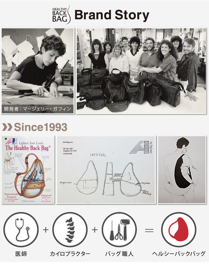 世界27ヵ国に愛用者を持つ「ヘルシーバックバッグ」は1993年に米国ニューヨーク州で誕生しました。バッグ職人、医師、カイロプラクターの専門家チームが背骨にけがをして重い荷物を持ちにくい悩みを持つ女性のために共同開発。背中のカーブに沿った形状が身体にフィットし、肩に集中する重さを分散。首や肩、背中への負担を軽減しながら収納力にも優れたバッグが生まれました。発売以来30年変わらないロングセラーの「しずく型」が特徴です。