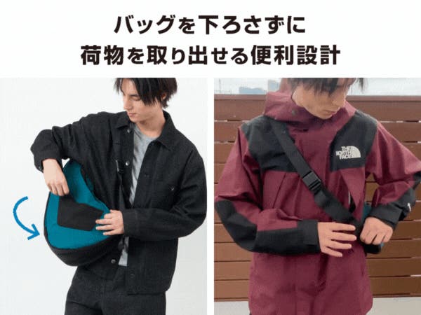 頻繁に出し入れするガイドブックや小物は、バッグを体の前面に回すだけでサッと取り出し可能です。旅先でお土産などで荷物が増えた際は、着脱が容易なクイックリリースバックルで素早く着脱。パスポートなどの貴重品は、背面に密着するセキュリティーファスナーで、盗難の心配なく安心して持ち運べます。