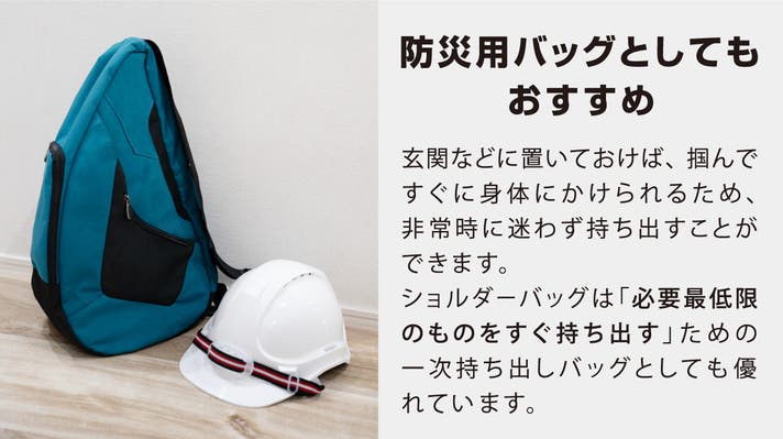 非常食や防災グッズ、貴重品など、必要最低限のアイテムをすっきり整理して収納できます。リュックより手軽に持ち運べるので、防災バッグとして常備しておくのにもぴったりです。