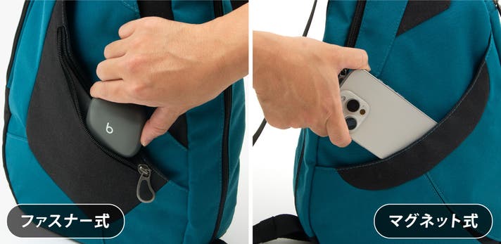前面のポケットには、ファスナー式とマグネット式を採用。