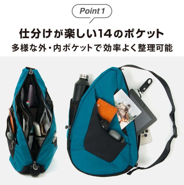 14のポケットで財布やスマホはもちろん、普段使う小物もまとめて収納できます。行きは荷物を軽く、帰りはお買い物で増えた荷物もラクラク入るのが嬉しいポイントです。