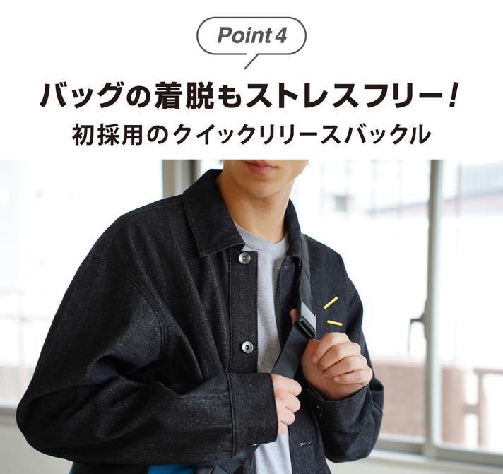 マグネット式のクイックリリースバックルを新採用。近づけるだけでカチッと自動的にロックし、外すときはスライドするだけで簡単にリリースできます。