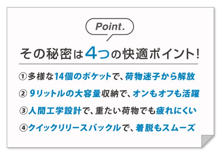 世界900万個の実績が選んだ高機能。背中にフィットする人間工学設計と計算された14のポケットが、探し物ゼロの快適さを実現します。
