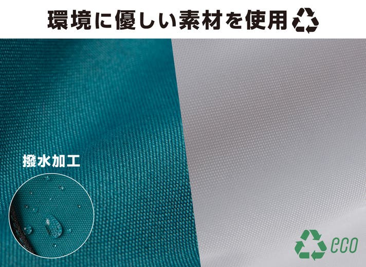 綺麗な発色の表地には、リサイクルポリエステル40%、ポリエステル60%の生地を使用。裏地にはリサイクルポリエステル100%の生地を使用しています。プラスチックボトルなどの再生材料からできている環境に優しい素材です。廃棄物を減らし、環境への影響を軽減します。また、撥水加工でちょっとした雨ならバッグの中身は濡れません。