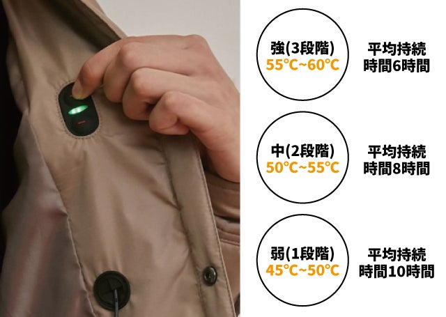 発熱パッドの温度調節が3段階で可能できるため、室内外、昼や夜のように温度差があるところでも簡単に温度を調節することができ、ジャケットを脱いだり着たり、 替え着を持ち歩く必要もありません。