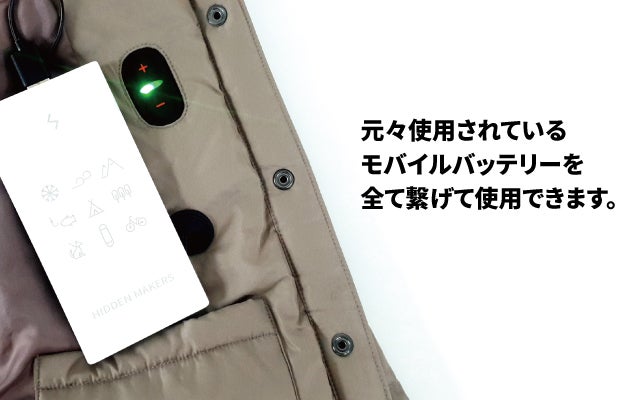 また、『HEAT-O TOUCH』は市販の様々な 5Vモバイルバッテリーと互換できるように設計し、元々使用されている5V モバイルバッテリーを繋げて使用できます。