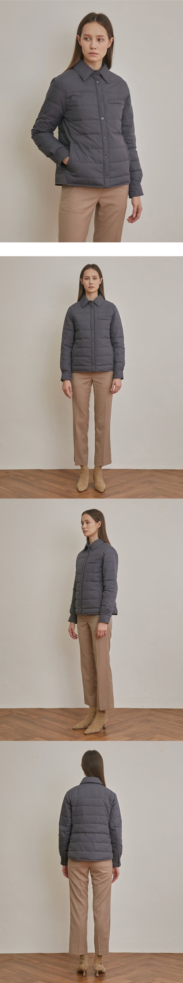 前後の身丈を異なってデザインして下半身がより長く見えるよう、短いフロント丈で体型補正効果を与え、腰からお尻の上部までは暖かさのために身丈をもう少し長く製作しました。