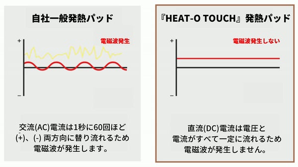 電磁波が発生する原因はほとんど交流電源であるからですが、『HEAT-O TOUCH』は直流(DC)で特別に設計され電磁波が発生しません!