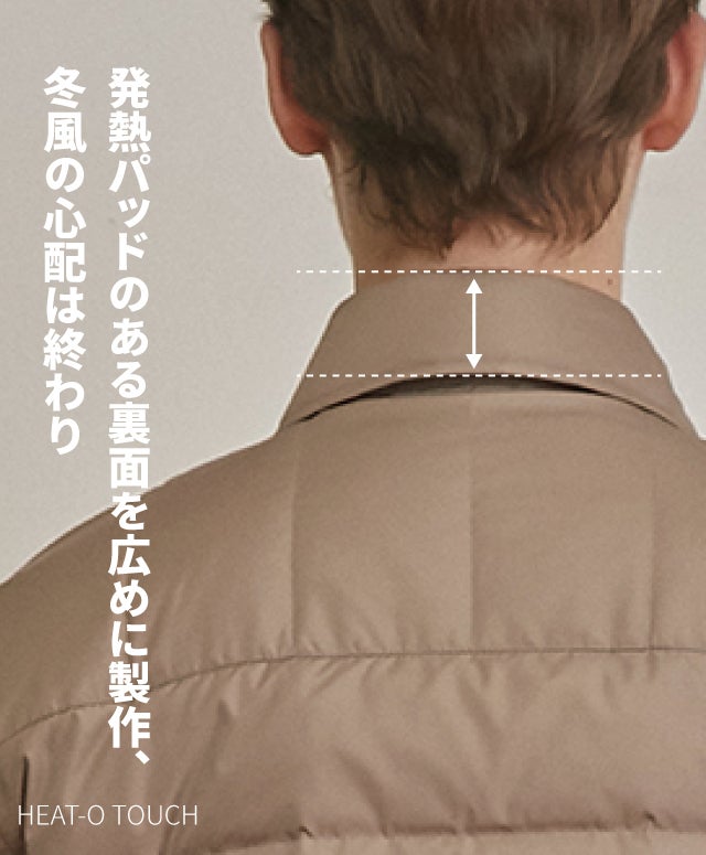 グースダウンと発熱パッドで作り上げた暖かい 『ヒートたち』 を自分と愛する 『人たち』 に伝える 『HEAT-O TOUCH (ヒートをタッチ)』 は、寒い冬、分厚いアウターのせいでお互い近づくことができなくて互いの暖かさを分かち合えないアウターではなく、スリムなフィットでいくらでも近づけられて、冷たい冬の風を越えて暖かいヒートたちを分かち合えるアウターです。