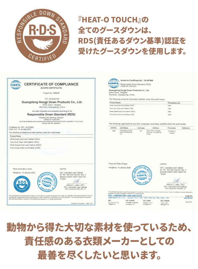 『HEAT-O TOUCH』の全てのグースダウンは、フォアグラを作るために強制的に飼料を食べさせたグースからや、生きている状態で虐待され、羽毛を採取されたグースから得たグースダウンを使用していません。